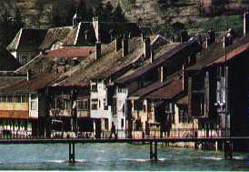 La Loue, majestueuse, traverse la belle ville d'Ornans d'un bief calme entre deux lignes de maisons sur pilotis. Ce «miroir» fluvial, où l'on contemple depuis le Grand Pont le décor inversé, est sans dote le plus beau fleuron de cette cité qui, pourtant, compte également quelques beaux monuments : l'église, reconstruite au XVIe s. à partir d'un édifice romain, l'hôtel de ville du XVIIIe s., l'hôtel de Grospain, du XVe s.